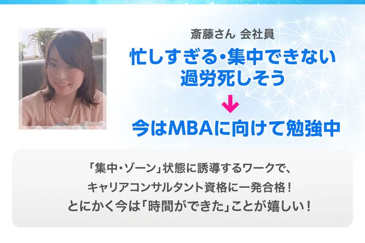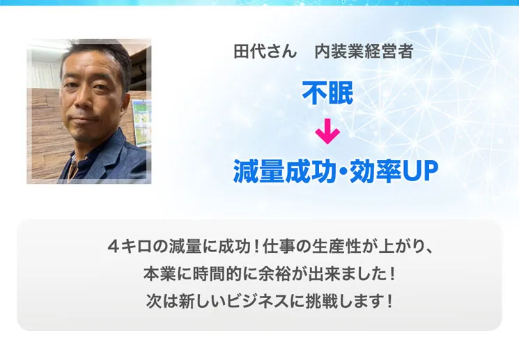 検査の結果をもとに、脳を最適化するための生活習慣などを指導させていただきます。食事、運動、睡眠などを適切にする事によって、衰えてきた集中力や記憶力を改善させたり、生産性や、アイデア力をUPする事ができます。