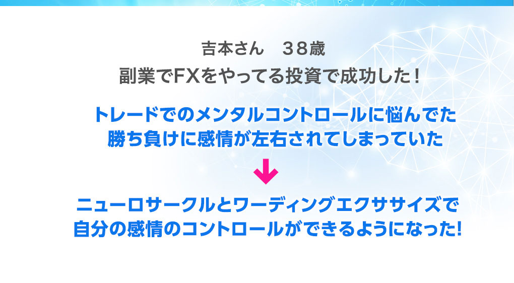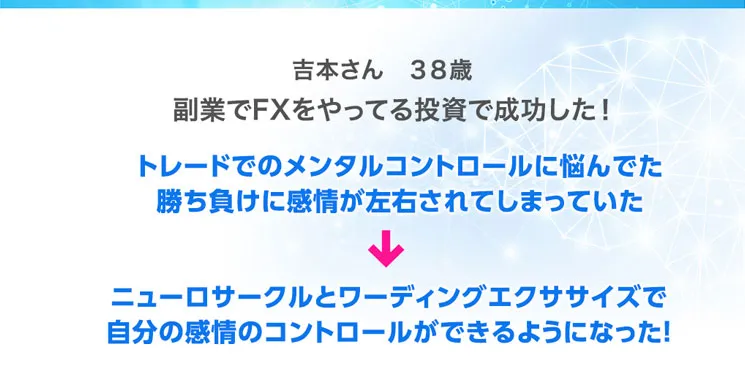 あなたに「脳が変わる」ことを体感してもらい、脳の調整方法を学び、自分で自由自在に脳をコントロールしてもらいます。